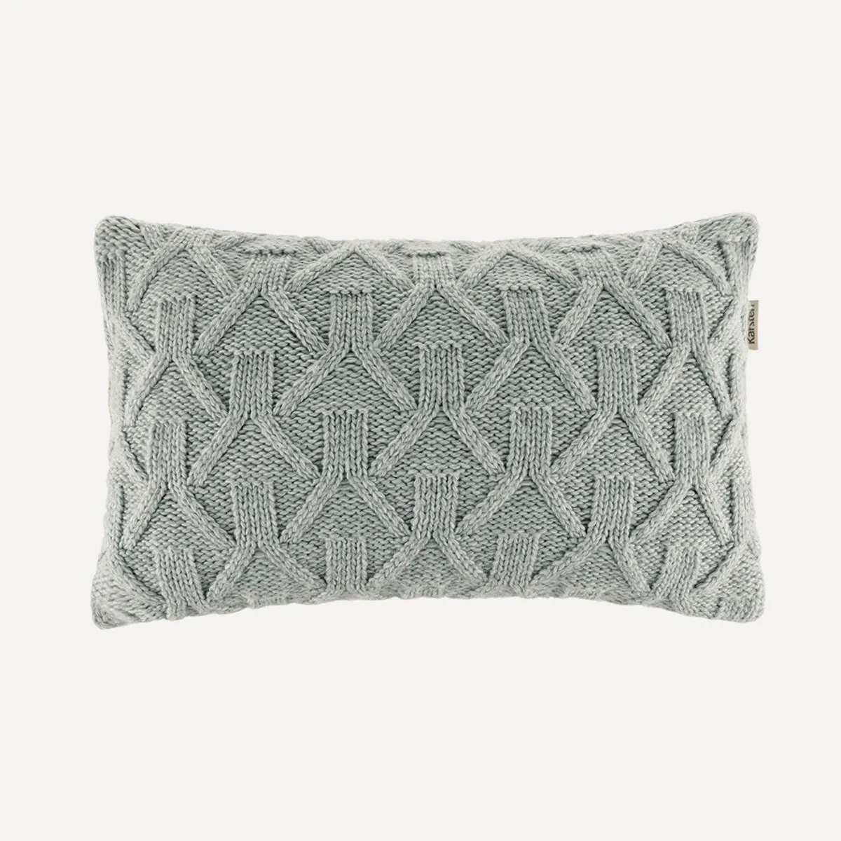 Descrição Visual Almofada Retangular em tricor com textura e relevo em cor cinza névoa com zíper e etiqueta decorativa