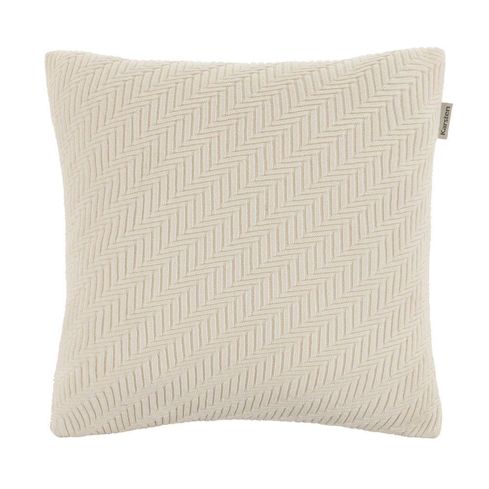 Atributos Almofada decorativa; Tricô geométrico; Acabamento emoldurado; Etiqueta decorativa Karsten; Almofada com zíper invisível