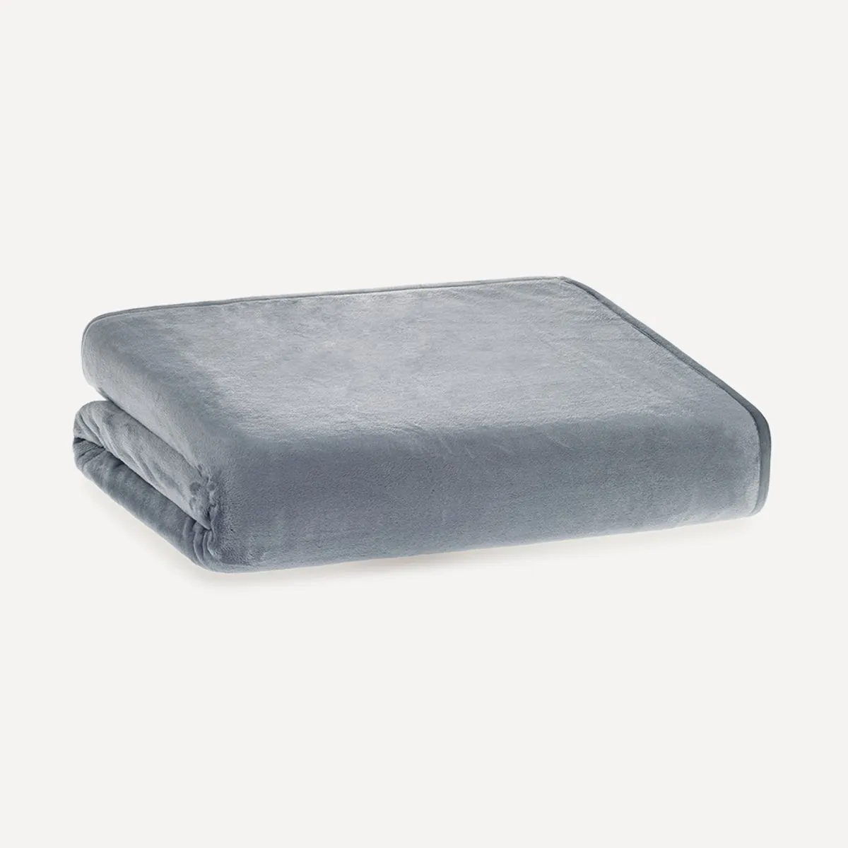 Descrição Visual Cobertor peluciado nos dois lados com toque ultra macio de cor cinza e bordo de 2cm