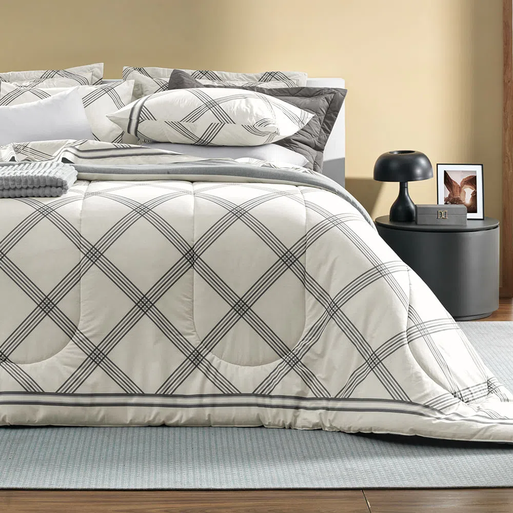 Colcha dupla face com cantos quadrados; Porta travesseiro com 3 abas de 5cm; Estilo cosmopolita; Enchimento 100% poliéster