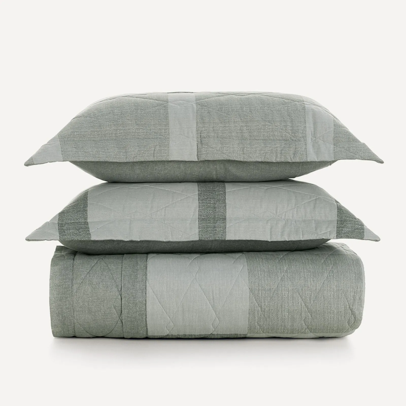 Descrição Visual Tons de verde e azul compõem uma estampa geométrica na colcha e nos porta-travesseiros. O verso, tem uma textura verde minimalista