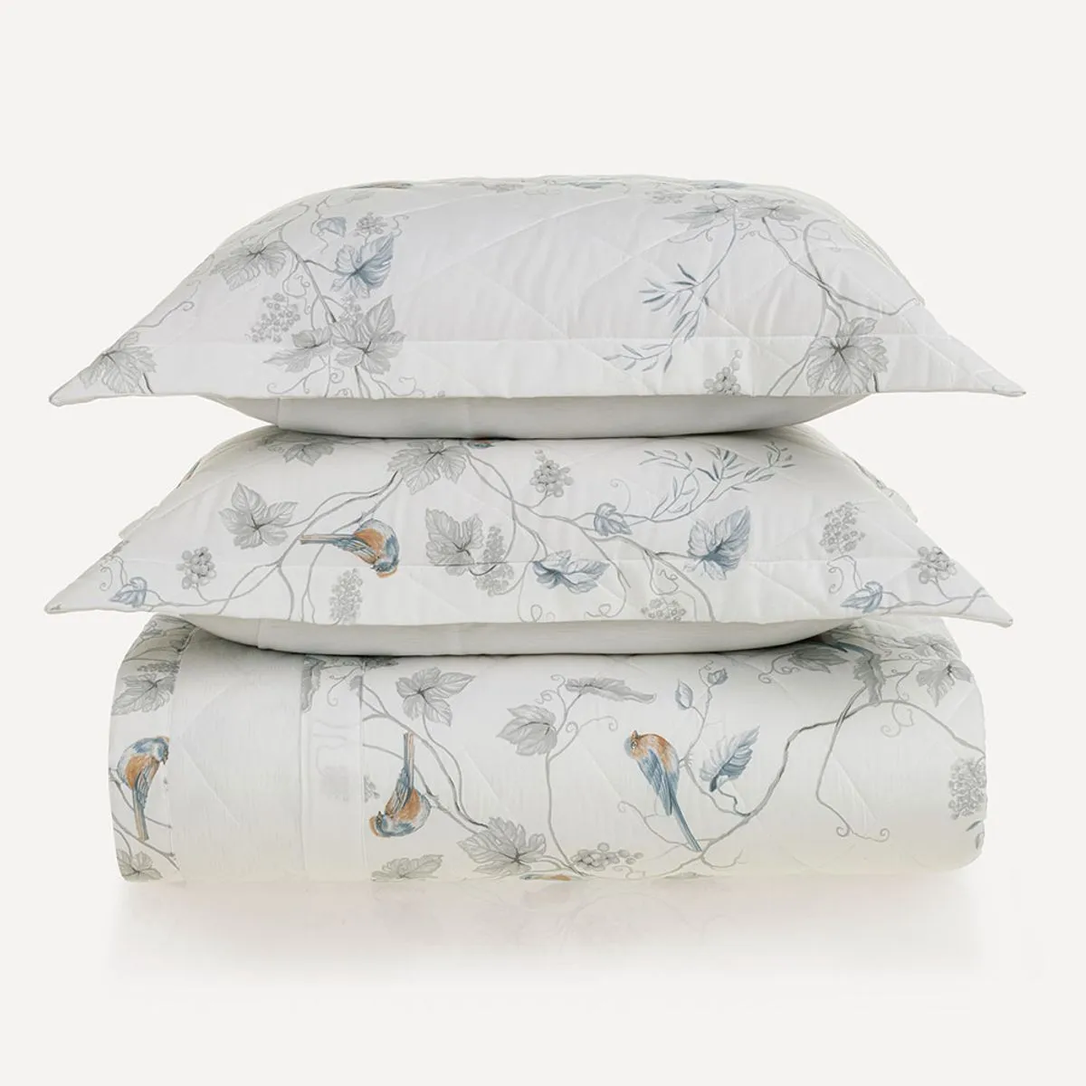 Descrição Visual Colcha dupla-face: frente na cor branca e estampa de folhas, cachos de uva e pássaros em tons de cinza, azul e laranja. Verso branco com textura suave.