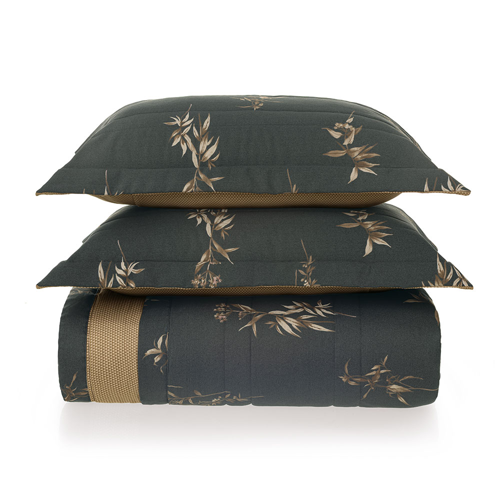 Descrição Visual Colcha dupla-face: frente na cor cinza com estampa de folhas e flores em tons de marrom. Verso marrom com estampa geométrica.