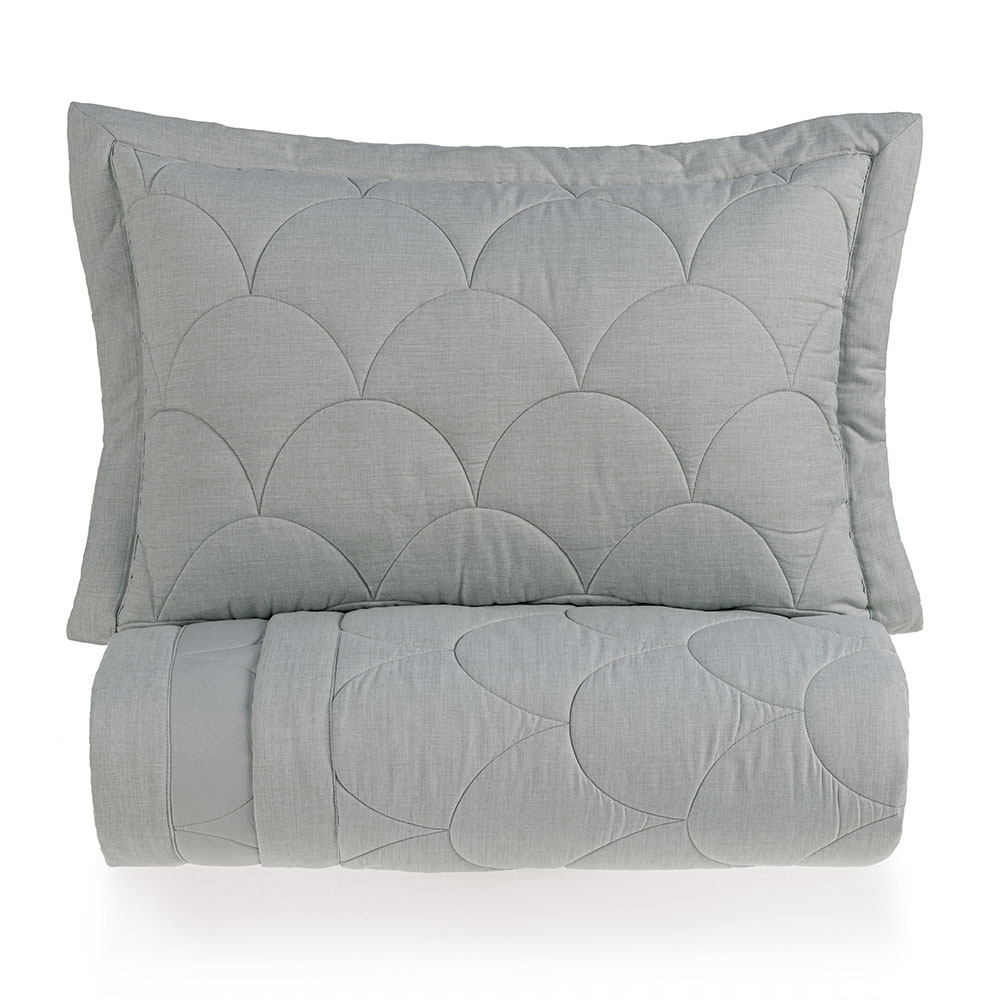 Atributos Tecido efeito mescla; Acabamento com bordo de 7cm; Cantos quadrados; Matelassado geométrico; Porta-travesseiro com 3 abas de 5cm; Manta de enchimento de 170g/m²