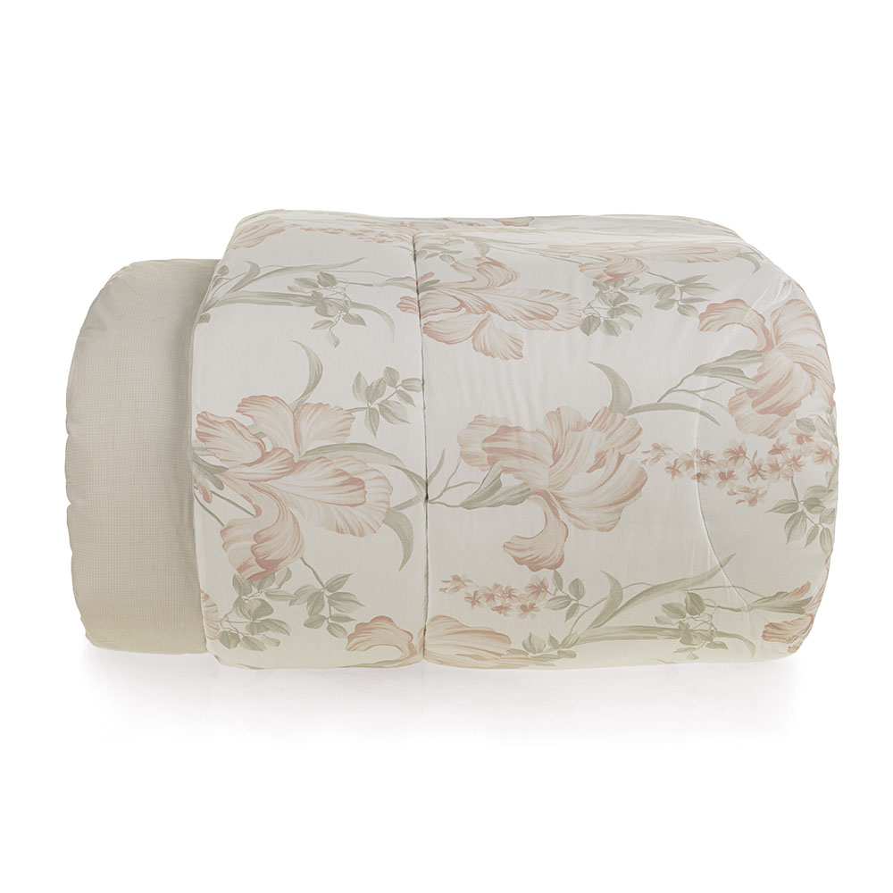 Descrição Visual Edredom dupla-face: frente com fundo branco e estampa floral rosa. Verso cinza com leve textura.
