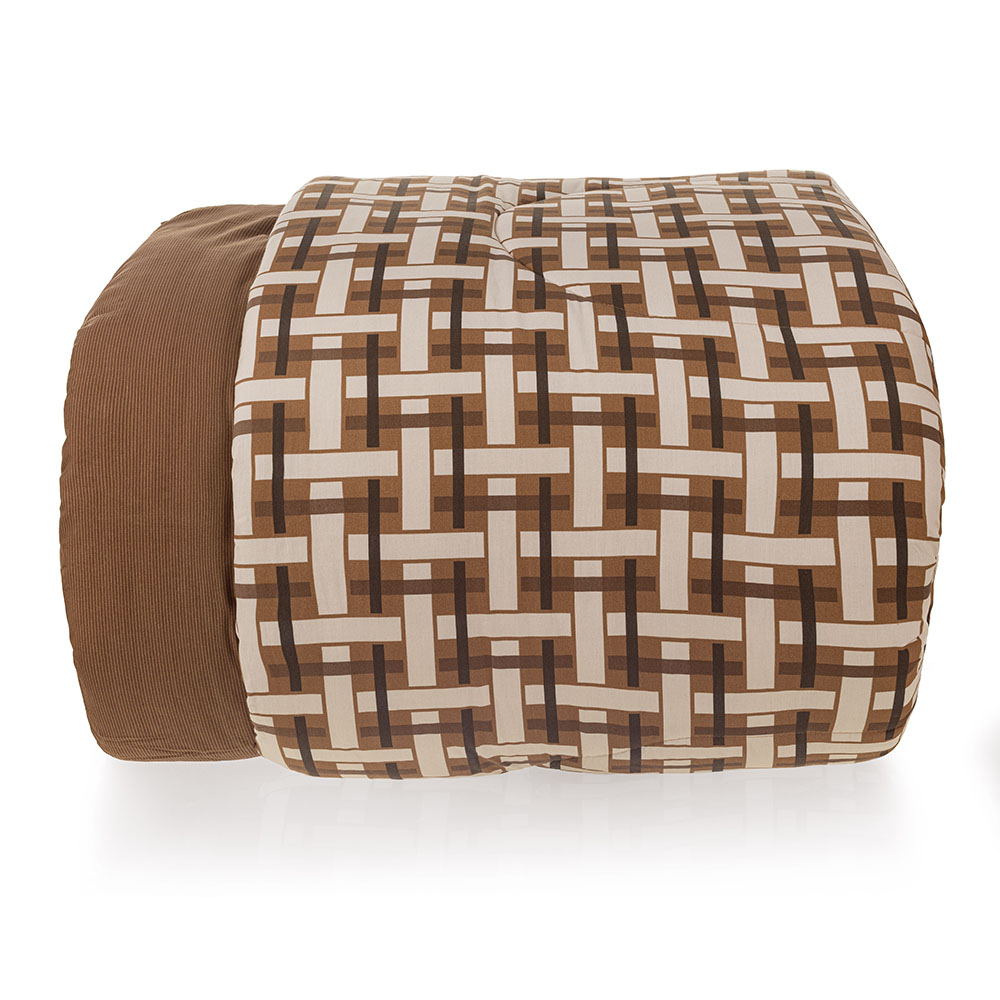 Descrição Visual Edredom dupla-face: frente com estampa geométrica em tons de marrom e bege. Verso marrom com listras.