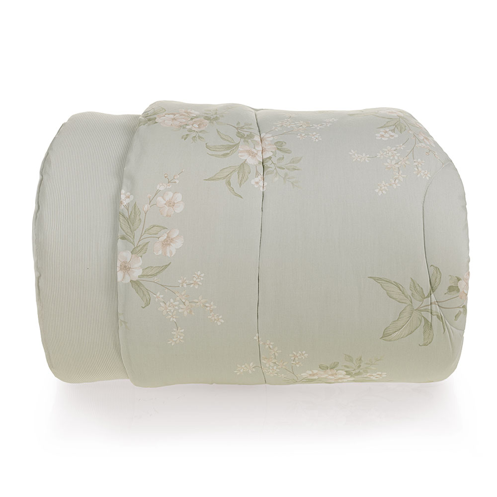 Descrição Visual Edredom dupla-face: frente com fundo verde e estampa floral em tons de rosa e branco. Verso verde com listras suaves.