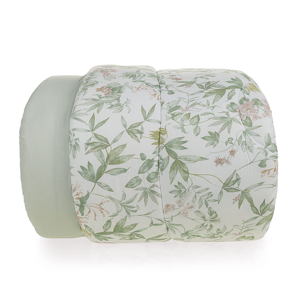 Descrição Visual Edredom dupla-face: frente com fundo branco e estampa floral em tons de verde. Verso em poá verde.