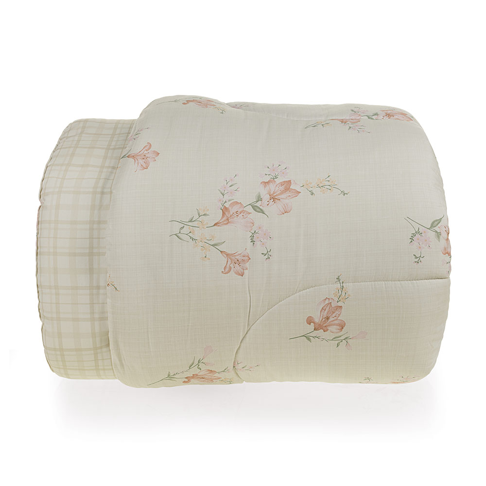 Descrição Visual Edredom dupla-face: Frente com fundo bege e estampa floral rosa. Verso em xadrez.