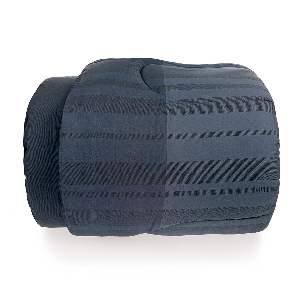 Descrição Visual Edredom dupla-face: frente com estampa geométrica em tons de marrom e azul. Verso azul com textura suave.