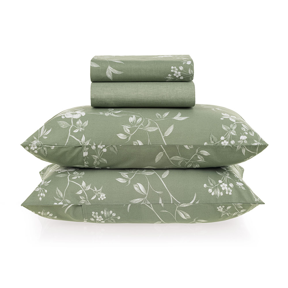 Descrição Visual Fronha e sobrelençol com fundo verde claro e estampa floral em tons de branco. Lençol com elástico verde com textura suave.
