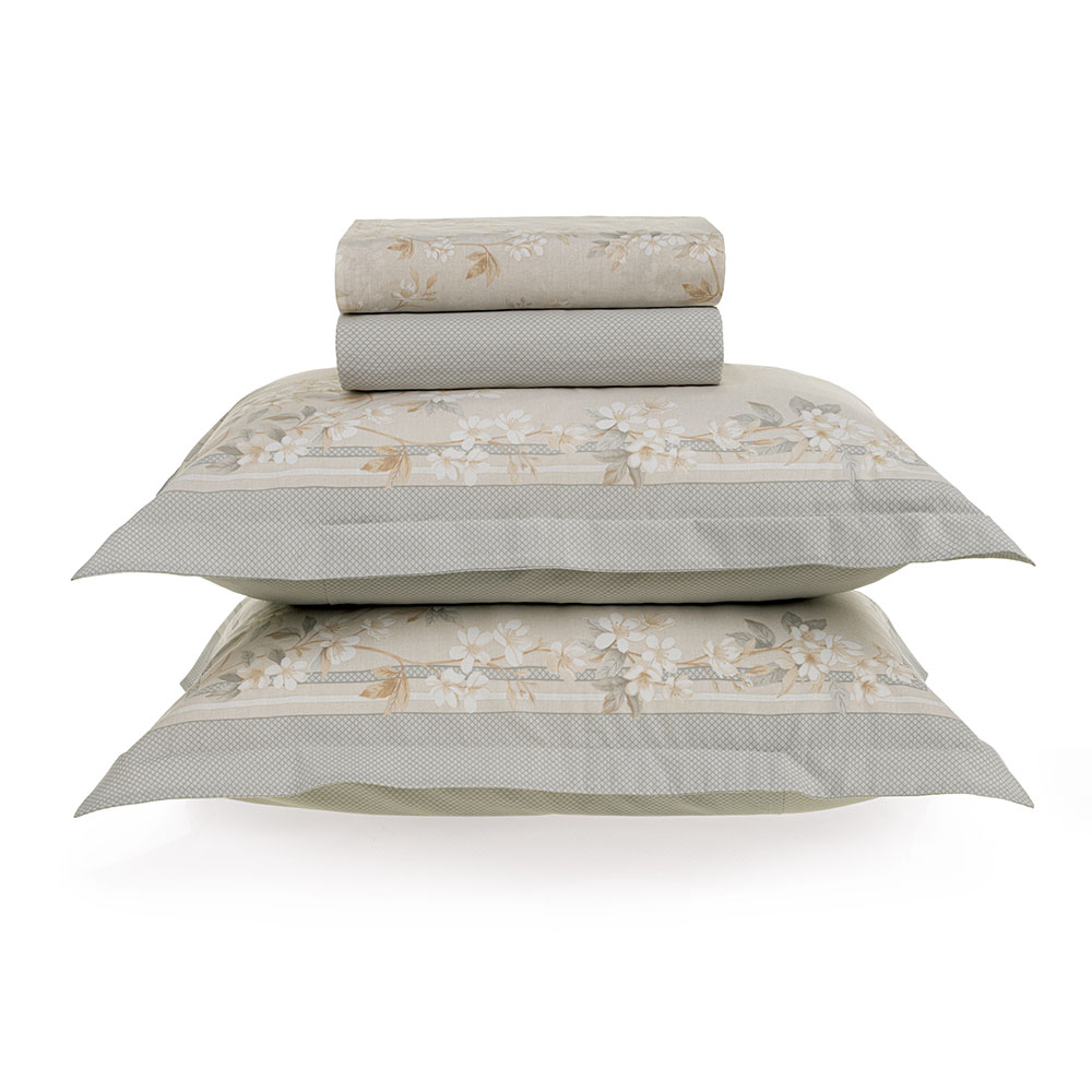 Descrição Visual Fronha dimensionada na cor bege com moldura cinza e estampa de flores. Sobrelençol bege com floral branco. Lençol com elástico cinza e leve textura.