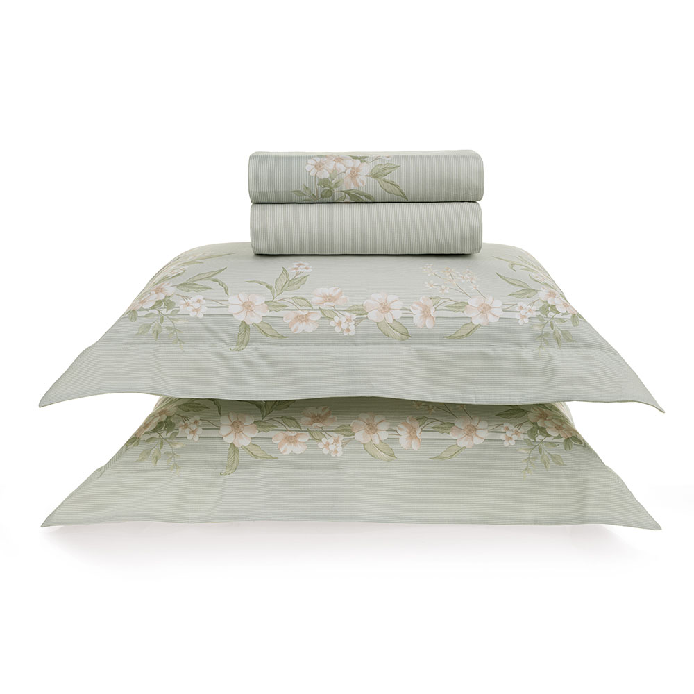 Descrição Visual Fronha dimensionada e sobrelençol com vira dimensionada em tons de verde com estampa floral. Lençol com elástico verde com listras suaves.