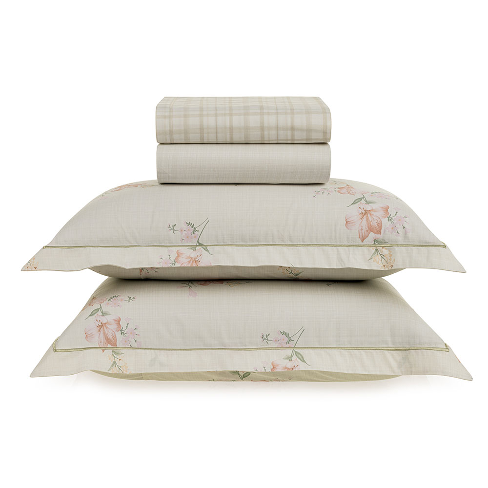 Descrição Visual Fronha bege com estampa floral rosa e ponto royal verde. Sobrelençol em xadrez. Lençol com elástico com leve textura.