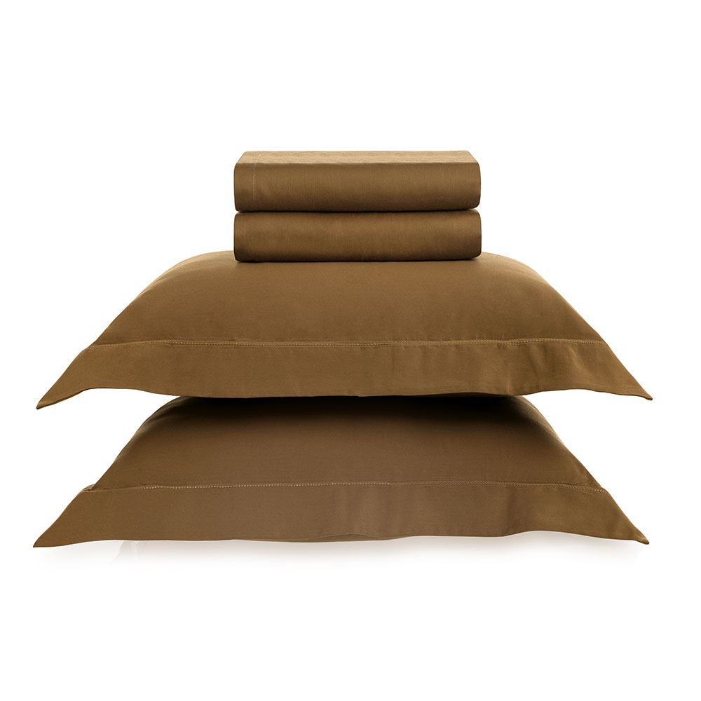 Descrição Visual Corpo tinto na cor marrom com ponto ajour aplicado nas 3 abas da fronha.