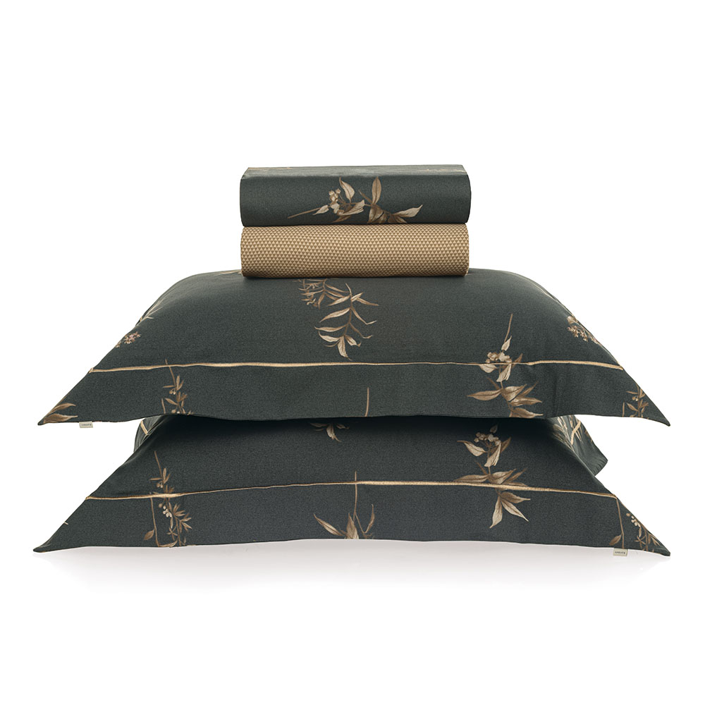 Descrição Visual Fronhas com ponto royal, sobrelençol na cor cinza com estampa de folhas e flores em tons de marrom. Lençol com elástico marrom com estampa geométrica.