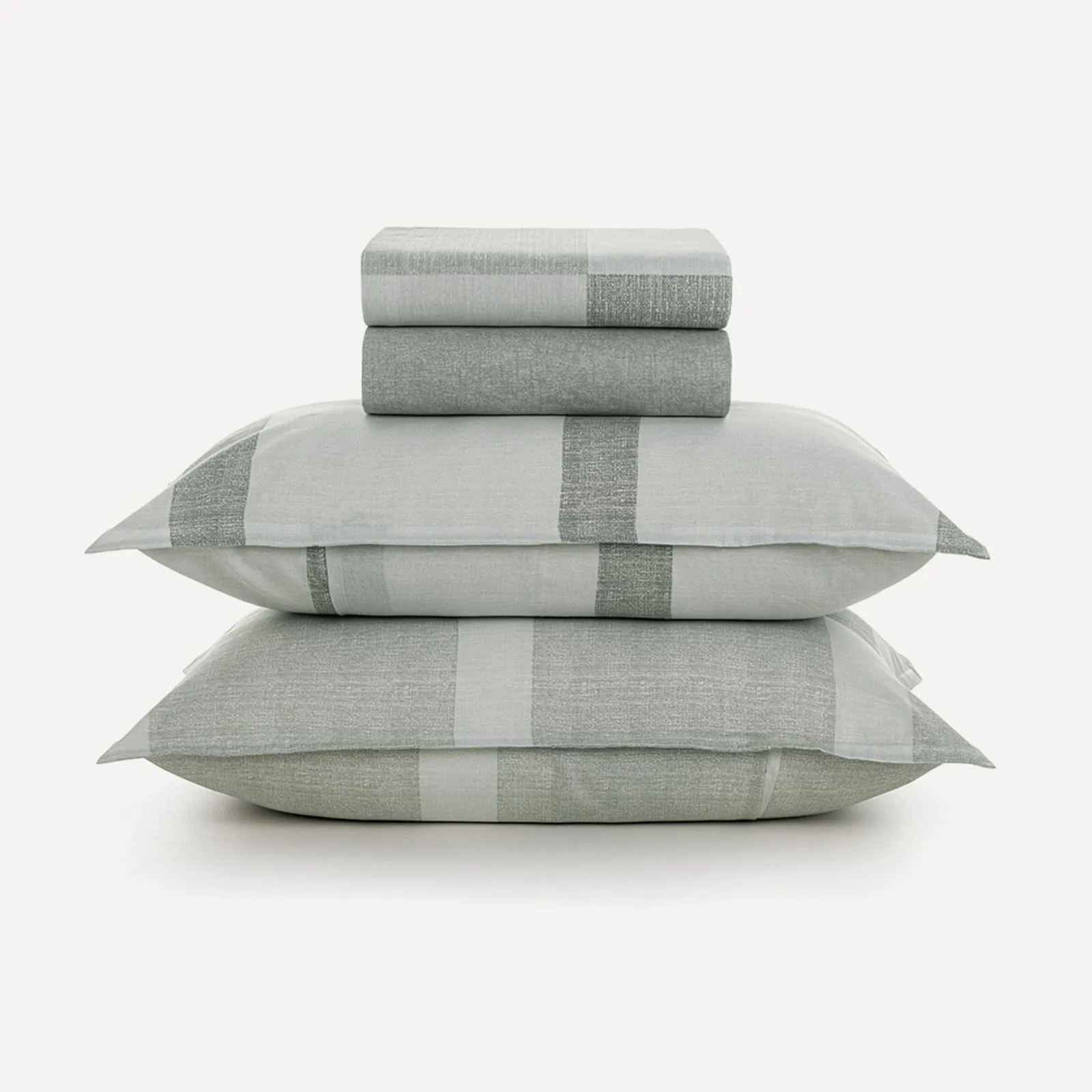 Descrição Visual Tons de verde e azul compõem uma estampa geométricca no sobre-lençol e nas fronhas. O Lençol de elástico tem uma pequena textura verde