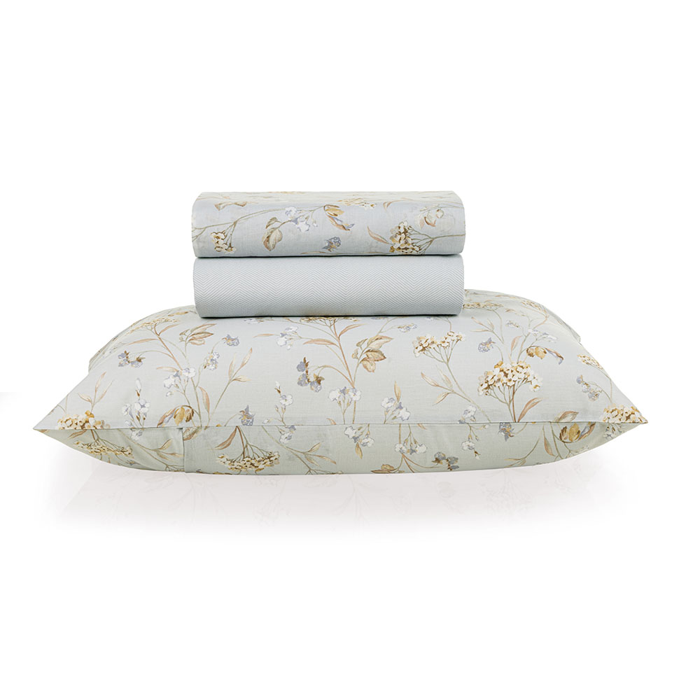 Descrição Visual Fronha e sobrelençol com fundo azul acizentado e estampa floral em tons de branco e bege. Lençol com elástico azul com textura suave.
