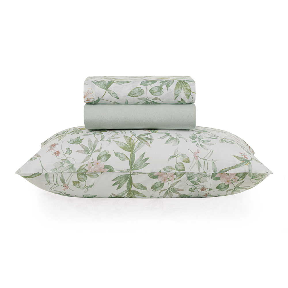 Descrição Visual Fronha e sobrelençol com fundo branco e estampa floral em tons de verde. Lençol com elástico em poá verde.
