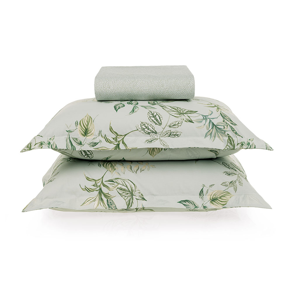 Descrição Visual Fronha verde com estampa de folhas. Lençol com elástico em poá verde.