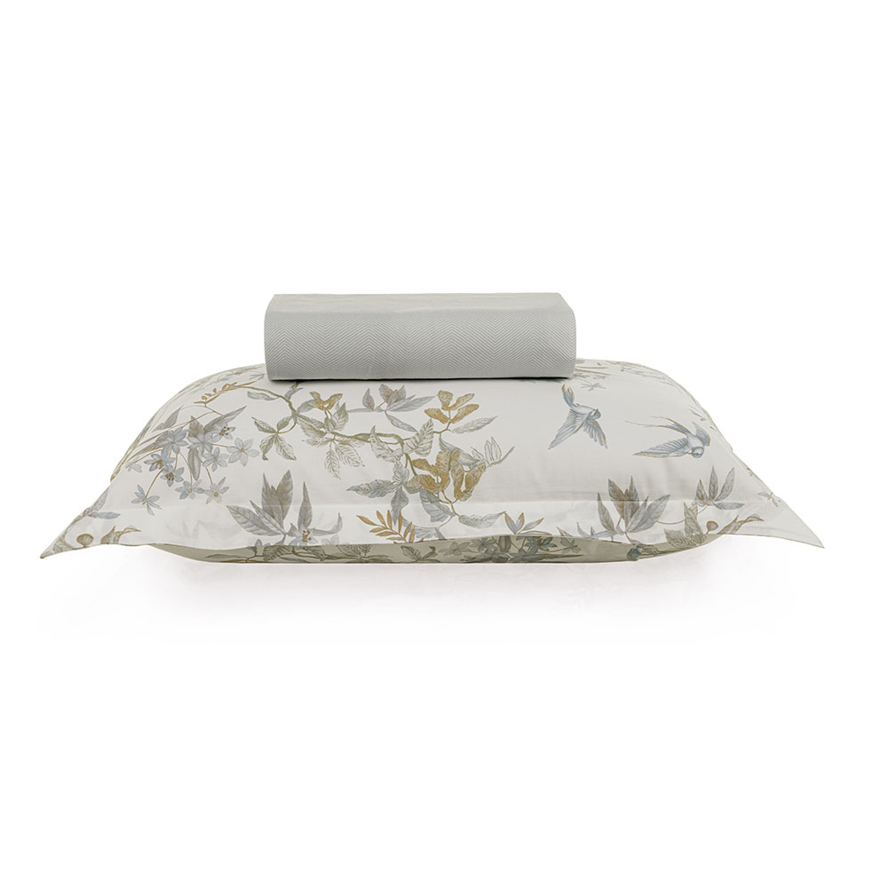 Descrição Visual Fronha branca com estampa de folhas, flores e pássaros delicados. Lençol com elástico cinza com estampa chevron.